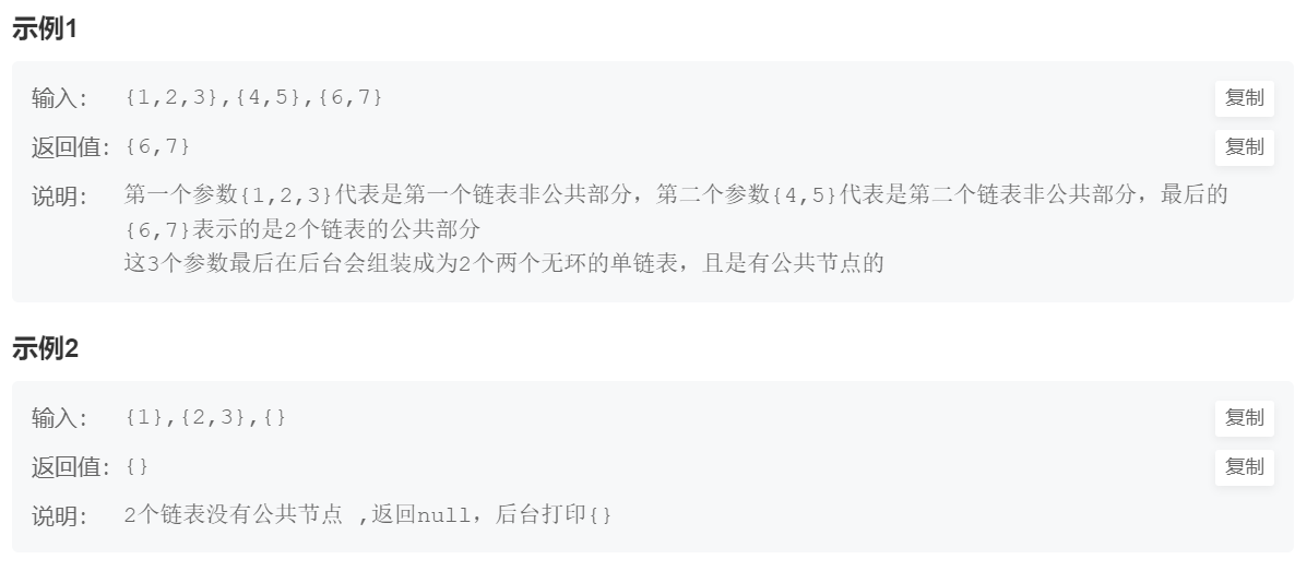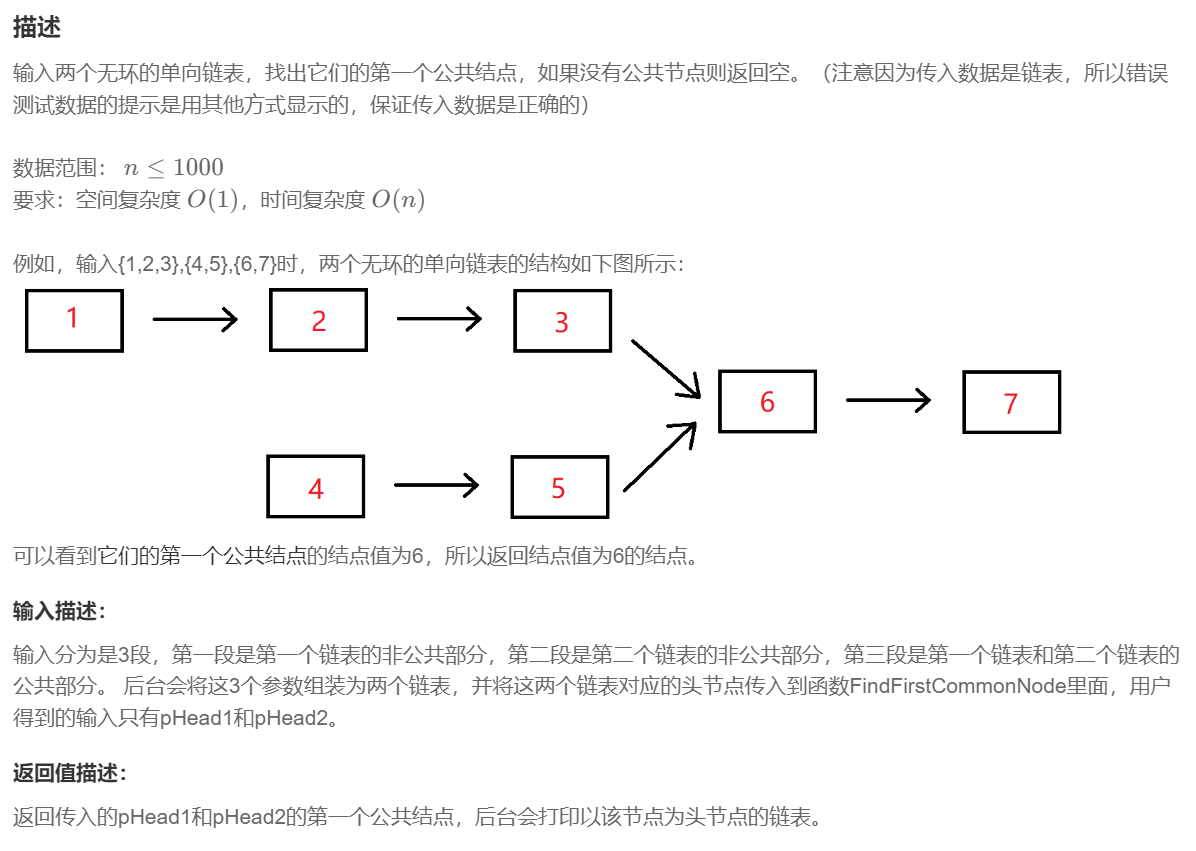 (上面的示例写得不太清楚,反之只要知道,传入两个链表,找出他们的公共节点,没有则返回null)