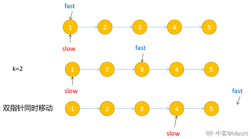 流程演示:(来自于题解链表中倒数最后k个结点_牛客题霸_牛客网 (nowcoder.com))