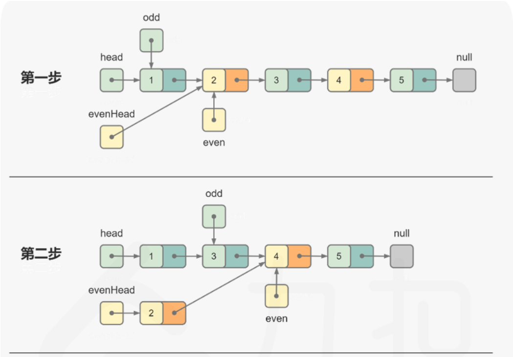 这题的思路主要是用两个链表分别记录奇数和偶数节点,最后再拼接在一起。因为是偶数在后面,所以使用一个哑节点evenHead来标记,奇数链表则直接用head即可。拆链表的时候先将偶数的下一个节点接入到奇数链表odd后(odd.next=even.next),偶数链表再将奇数节点的下一个接到自己后面(even.next=odd.next),循环条件even!=null是为了处理奇数个节点的链表的终止,even.next!=null是为了处理偶数个节点的链表的终止,最后别忘了将偶数链表的重新接在奇数链表后面(odd.next=evenHead)