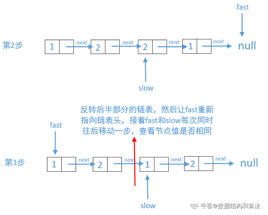流程演示:(来自于题解判断一个链表是否为回文结构_牛客题霸_牛客网 (nowcoder.com))