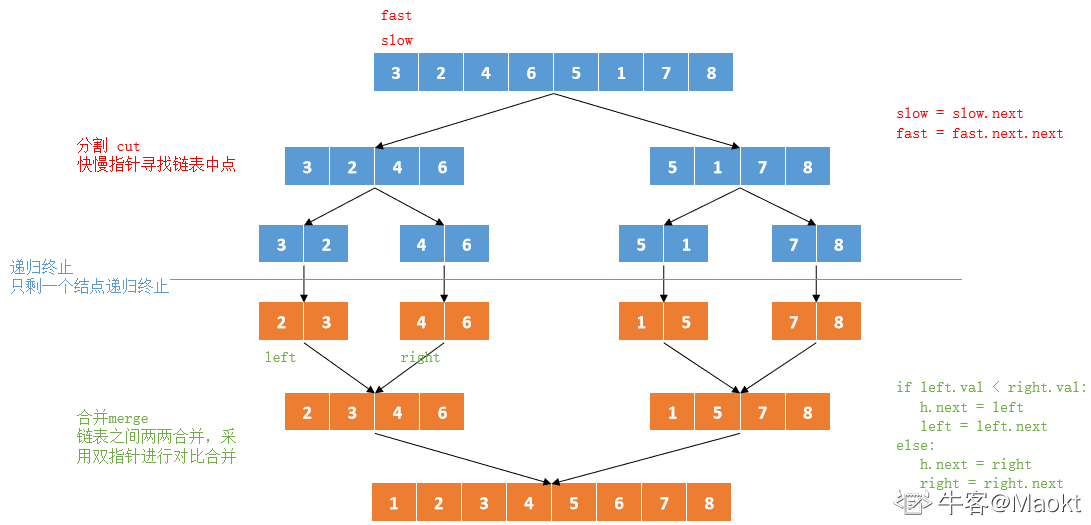 这题的主要思路就是二分+递归 ,跟上一篇的"链表中的节点每k个一组翻转 "类似,先使用一个快慢指针找出当前链表的中间节点(注意起始位置和边界),然后将当前链表分成两部分分别递归,最后使用经典的哑节点dummy和辅助节点pre进行排序/合并左右链表,注意最后要判断是否合并完pre.next=((l!=null)?l:r),然后依次返回dummy.next即可