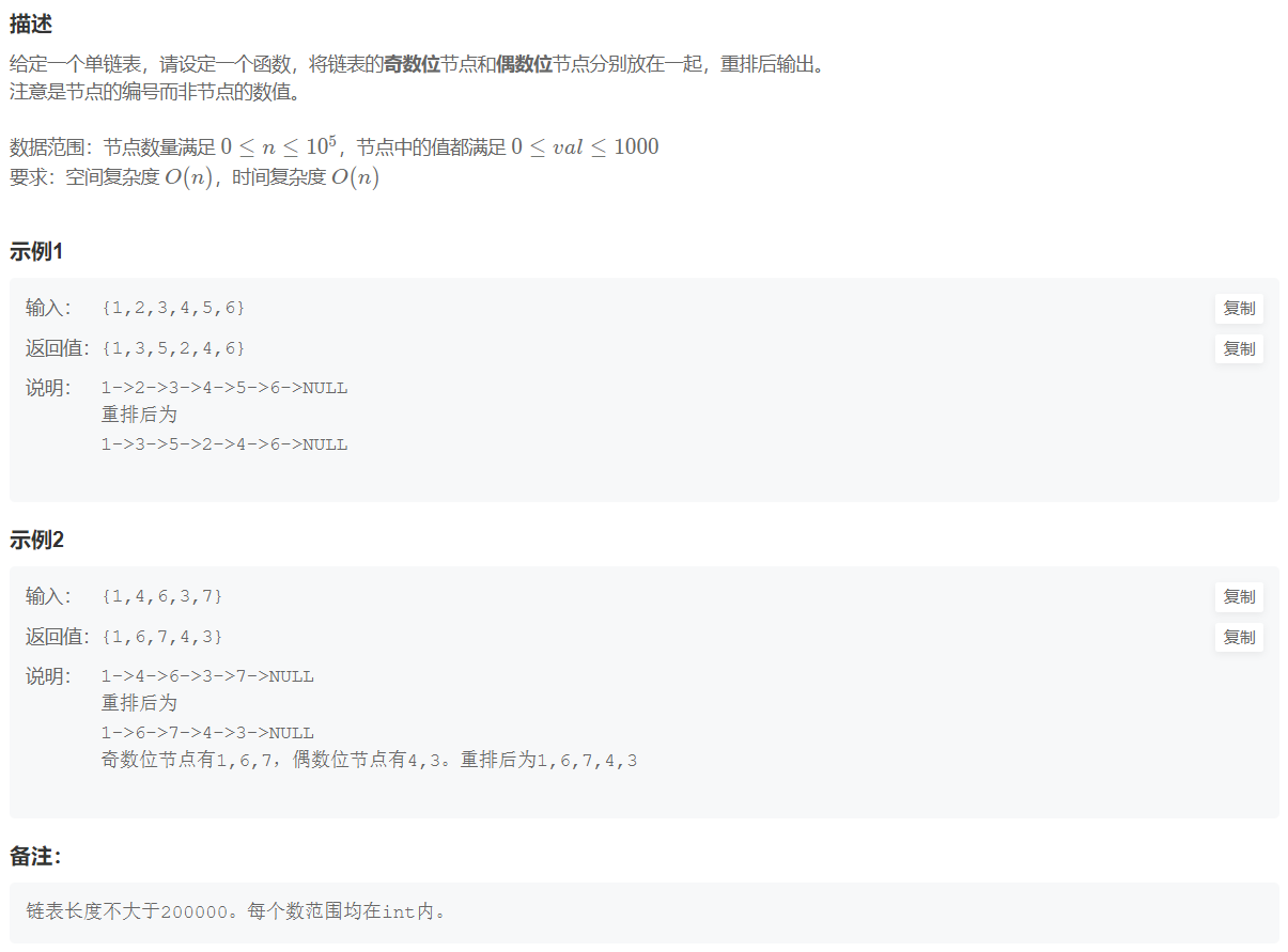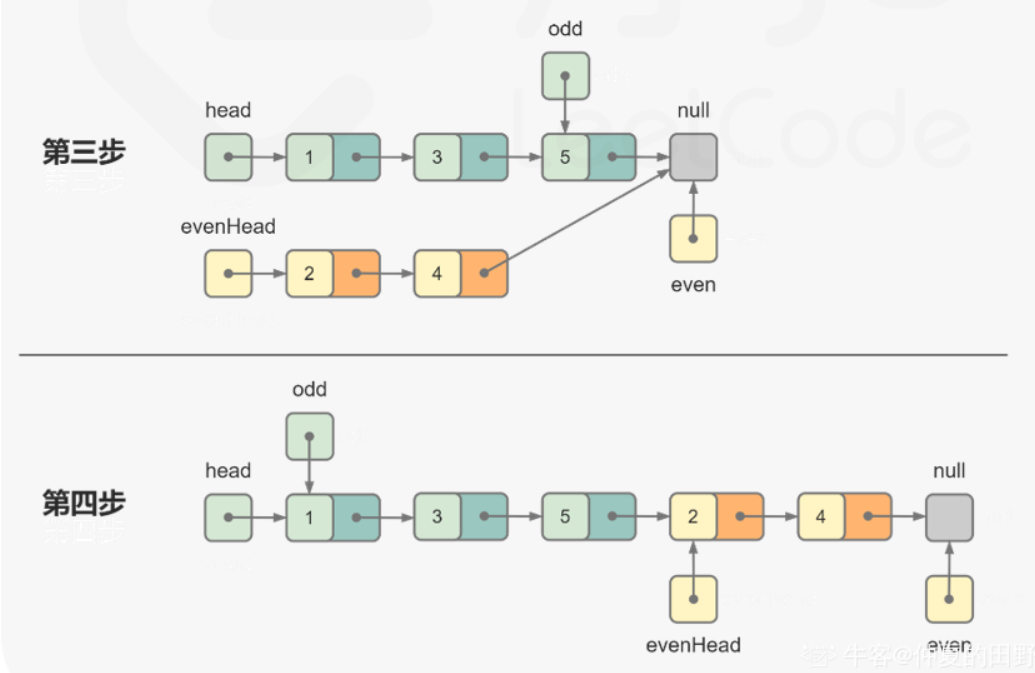 流程演示:(来自于题解链表的奇偶重排_牛客题霸_牛客网 (nowcoder.com))