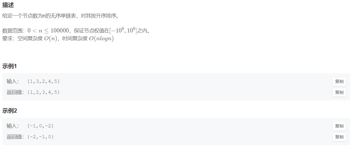 时间复杂度O(NlogN):N表示链表结点数量,二分归并算法O(NlogN)
