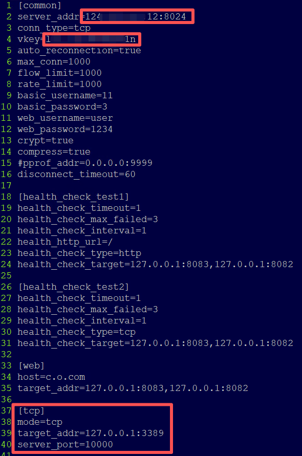 将windows_amd64_client.tar.gz拷贝到需要远程连接的目标电脑上,解压到windows_amd64_client文件夹,修改配置文件conf\npc.conf,【common】栏里server_addr改为nps运行的云服务器地址和端口,8024为服务器默认端口,vkey修改为server端创建的客户端的"唯一验证秘钥"。【tcp】栏里target_addr=127.0.0.1:3389,server_port=10000,表示映射外网10000端口到本机的远程桌面端口3389,这个可以根据需要修改,比如映射ftp端口21、ssh端口22,或者映射到局域网其他机器IP地址上都可以。
