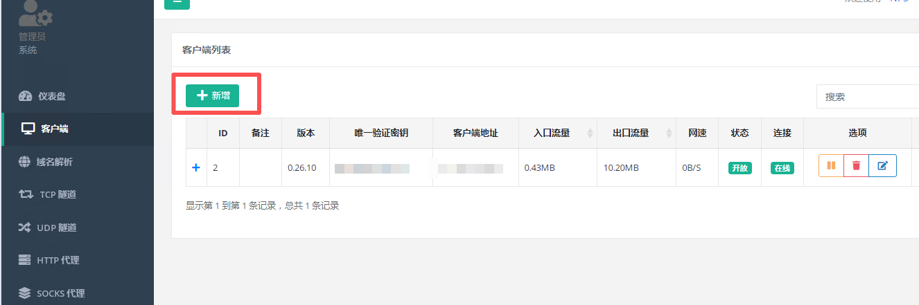 接着创建隧道,选中左侧的TCP隧道,点击"新增"按钮,客户端ID栏填入刚创建的客户端ID,即可创建一条隧道。后面就可以在客户端电脑上连接这条隧道了。
