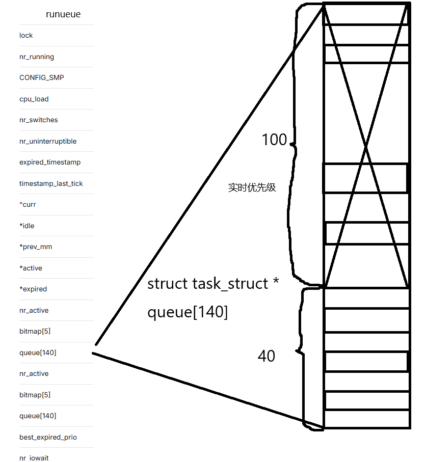 Linux会把进程储存在queue这个指针数组中,实际上Linux的进程优先级一共有140个,只不过[0,99]这一百个都是实时优先级,后面的40个才是我们现在常用的优先级。