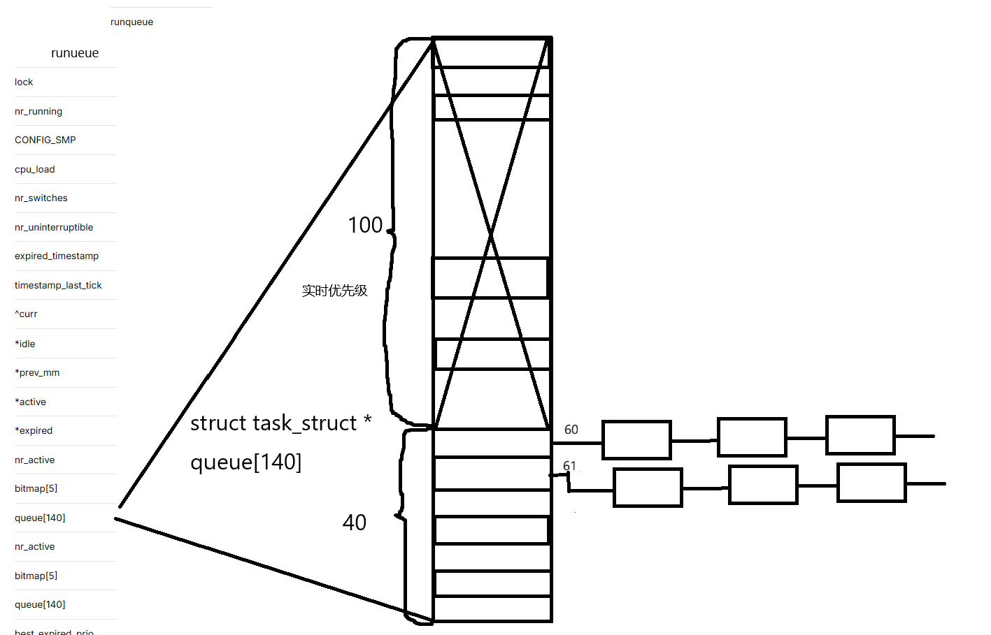 我们平时看到的优先级范围是[60,99],而在数组的下标却是[100,140];那么进程是怎么在queue中被组织的呢?