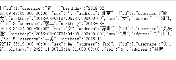 javapublic class User { private Integer id; private String username; private Date birthday; private String sex; private String address; public User() { } public User(Integer id, String username, Date birthday, String sex, String address) { this.id = id; this.username = username; this.birthday = birthday; this.sex = sex; this.address = address; } public Integer getId() { return id; } public void setId(Integer id) { this.id = id; } public String getUsername() { return username; } public void setUsername(String username) { this.username = username; } public Date getBirthday() { return birthday; } public void setBirthday(Date birthday) { this.birthday = birthday; } public String getSex() { return sex; } public void setSex(String sex) { this.sex = sex; } public String getAddress() { return address; } public void setAddress(String address) { this.address = address; } @Override public String toString() { return "User{" + "id=" + id + ", username='" + username + '\'' + ", birthday=" + birthday + ", sex='" + sex + '\'' + ", address='" + address + '\'' + '}'; } } -