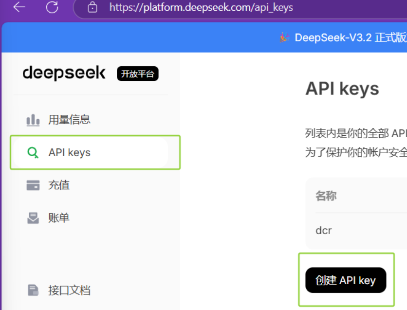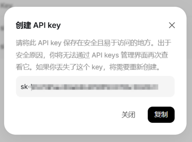 注意:创建后API key只出现一次,请存储在安全位置,例如:环境变量或者配置文件中