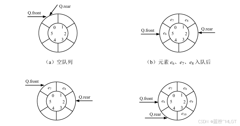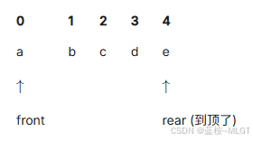 - 定义: 一种"先进先出 "的线性表,在队列中允许插入元素的一端称为队尾 ,允许删除元素的一端称为队头。
