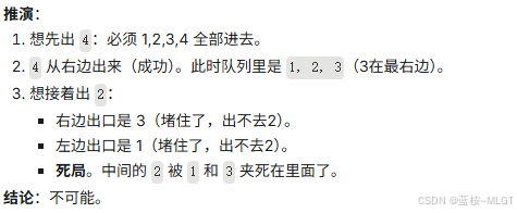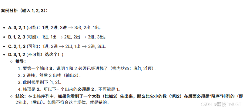 考题:有一个栈,输入序列是 1,2,3(按顺序入栈,但中间随时可以出栈),问:下列哪个出栈序列是不可能的?