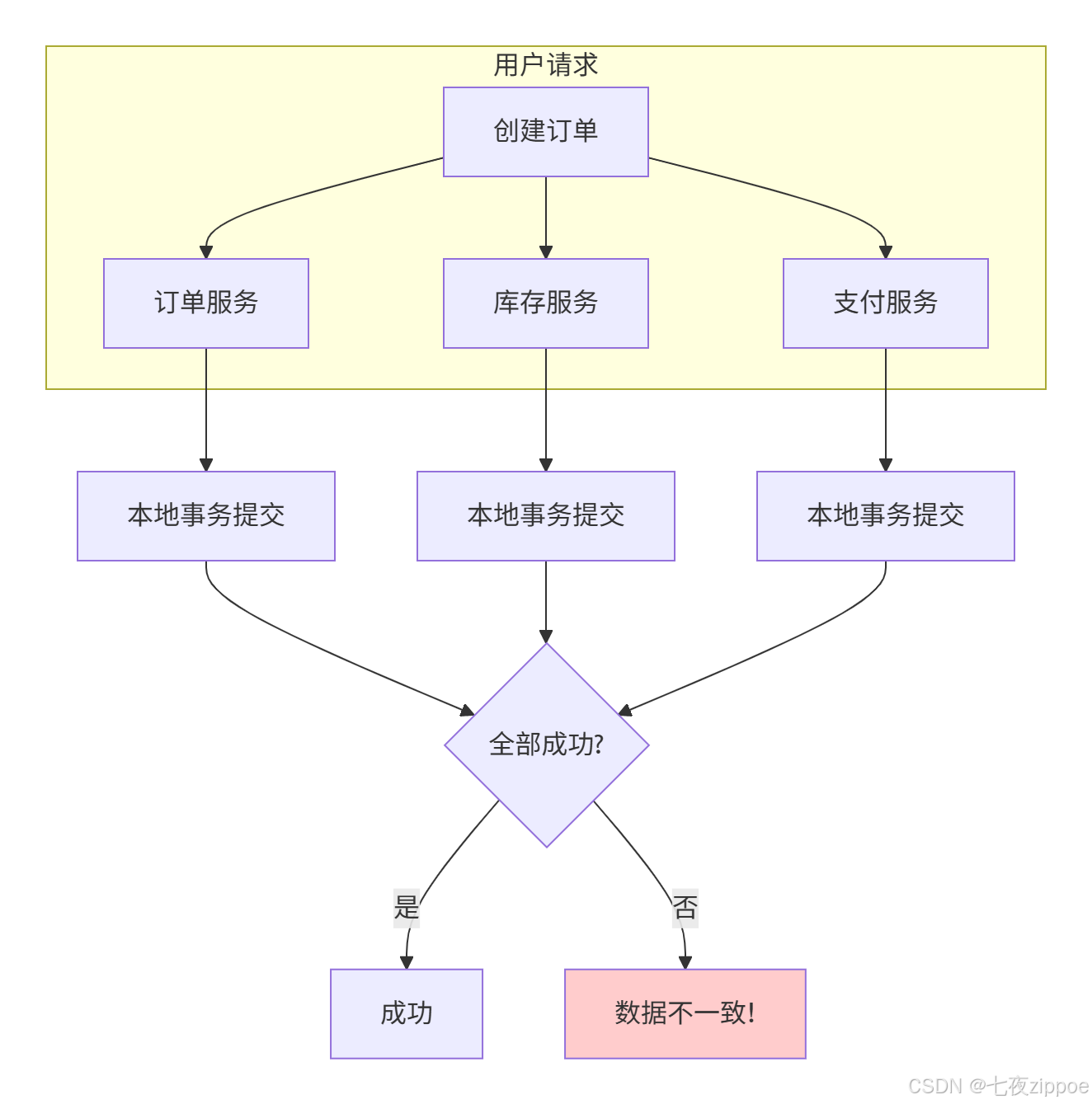 问题:三个服务独立提交,任何一个失败都会导致数据不一致:
