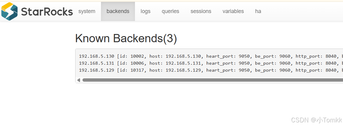 作用: 查看 BE/CN 节点(存储与计算节点)的状态与资源。 你通常能看到: Alive/心跳、节点 ID、IP/端口 磁盘使用、容量、是否可调度 可能还有 tablet 数、负载等 常见用途: 你之前遇到的 replication_num=3 但只有 2 台 BE Alive,这类问题就是在这里一眼确认(Alive 节点数不够就无法分配副本)。