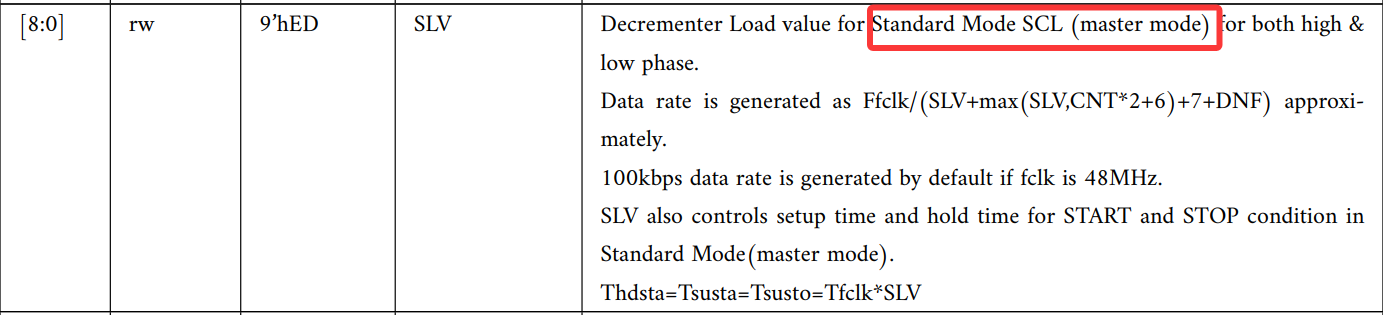 因此根据计算公式,当fclk为48Mhz时,SLV+max(SLV,CNT*2+6)+7+DNF) 需要大于480,其中DNF为滤波数字滤波器延迟,这里没有开启数字滤波器