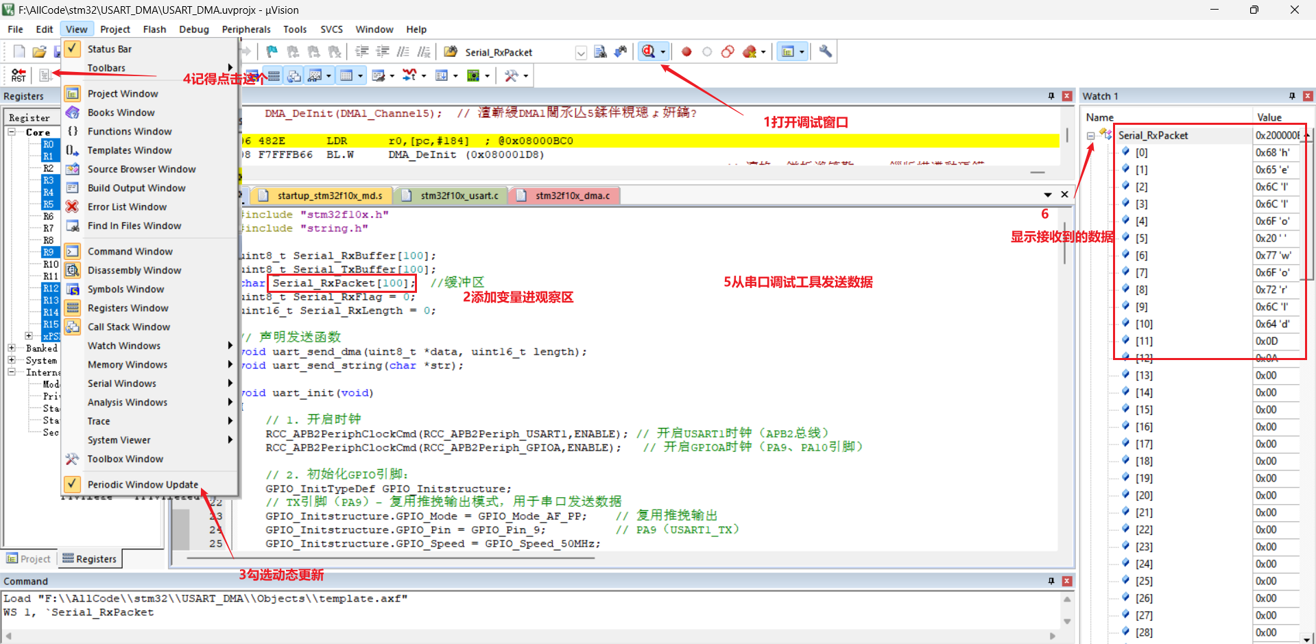 基本使用的整体流程主要如下:时钟配置(USART及GPIO)、引脚配置、USART配置、中断配置、DMA配置(发送和接收)、启动USART,还有配置对应USART的中断函数。