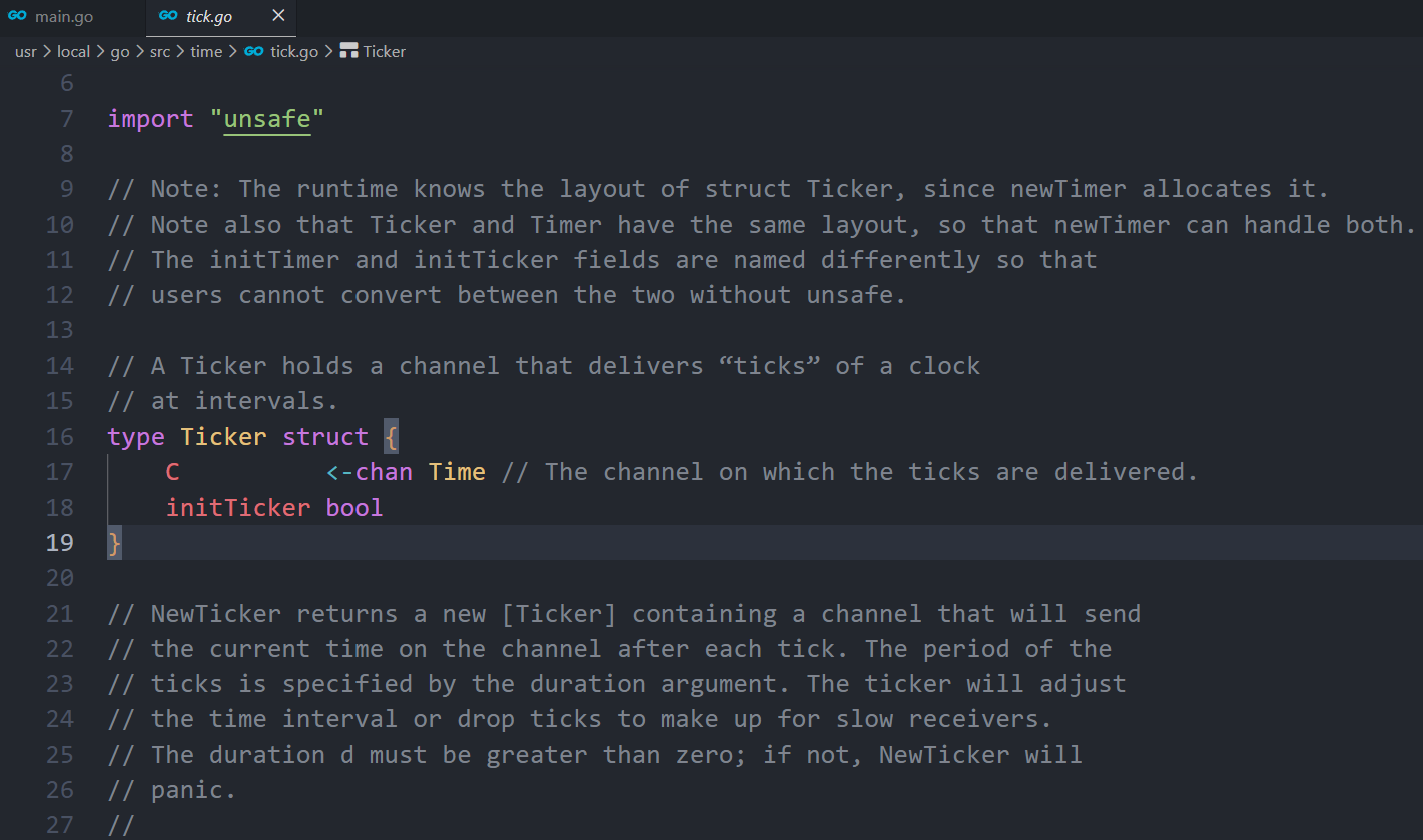 如果没有看过实际的 source code,就不会发现其实在注解的时候已经有明确说明了,Stop 并不会关闭 channel,预防读取 channel 发生错误,所以在 Ticker 的使用上,比较推荐下方这种写法,可以有效的执行超时之后下方的程式码,实现起来也比较优雅。