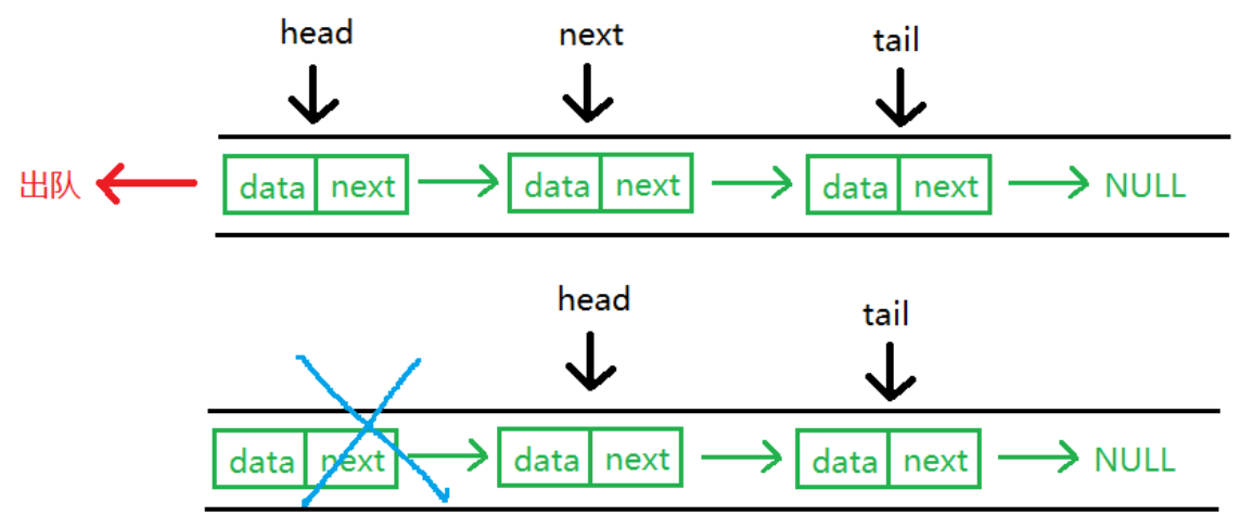 功能:基于链表实现队列出队,移除队列头部元素(队列遵循 "先进先出"),释放节点内存并更新指针 / 元素个数;