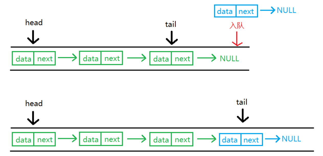 空队列:头尾指针均指向新节点;非空队列:尾节点后继指向新节点,尾指针移至新节点;