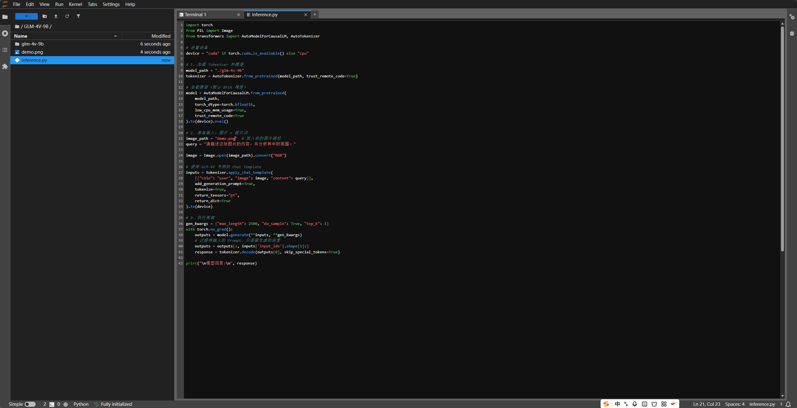 创建一个 inference.py 文件,填入以下代码。该脚本支持加载本地权重并进行一次图文对话。
