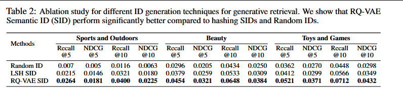 论文进行了一项消融研究,发现RQ-VAE确实比LSH效果更好。另一个选项是分层使用k-means聚类,但它失去了不同聚类之间的语义意义。
