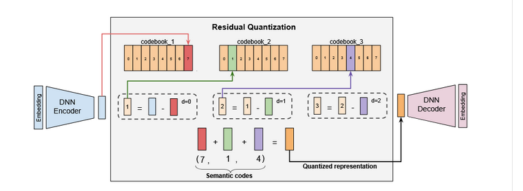 从码本1选最接近 z_e 的向量 q₁(捕获主要结构),计算残差 r₁ = z_e - q₁,从码本2选最接近 r₁ 的向量 q₂(捕获中级细节),计算残差 r₂ = r₁ - q₂,...捕获精细细节...。最后z_q = q₁ + q₂ + q₃+...。一般2-4级。