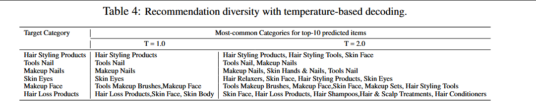 推荐多样性:具有较差多样性的推荐系统可能对用户的长期参与有害。在解码过程中基于温度的采样可以有效地用于控制模型预测的多样性。