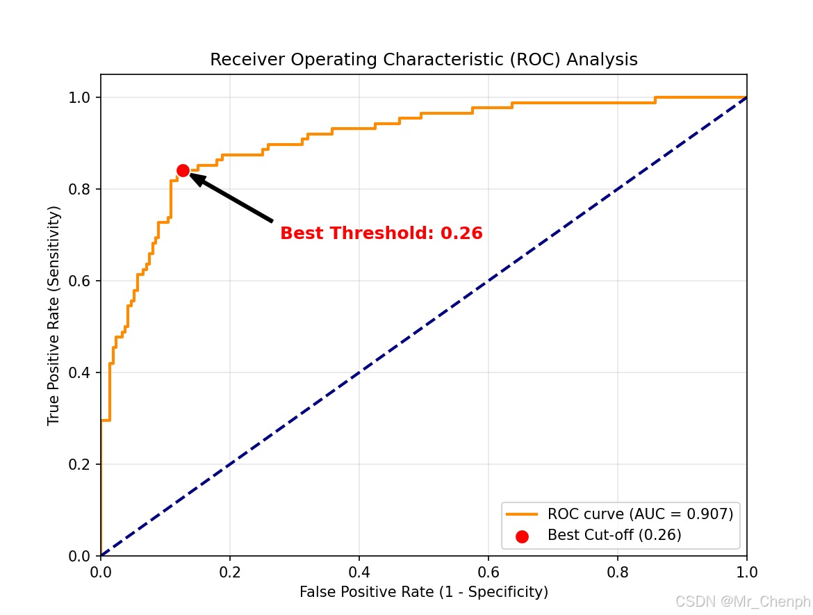 模型输出通常是 0 到 1 之间的概率。我们需要一个"切点"来决定超过多少分为阳性。 最常用的方法是 约登指数 (Youden's J statistic):