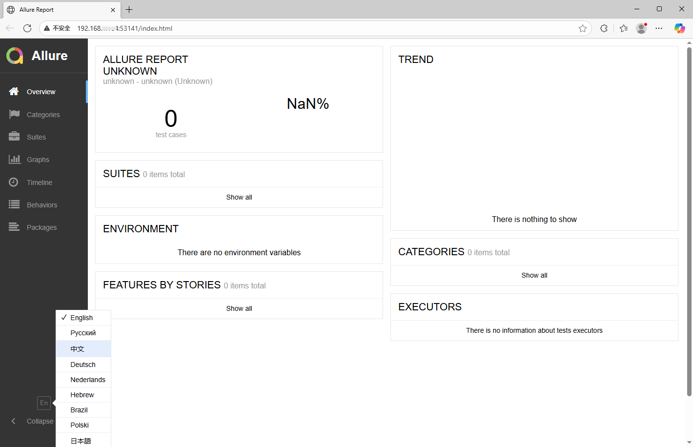 5、可以看到生成的 allure 测试报告有些模块是没有信息显示内容,还不是很完善;这是一个最基本的测试报告;其他测试报告的内容后续再另行添加优化;