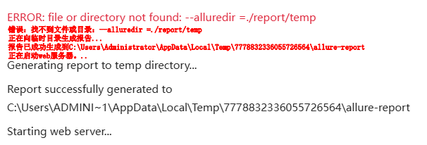 4、例如:若发生找不到文件或目录等错误提醒则注意命令行参数中等号前后的空格问题"--alluredir =./report/temp" ;