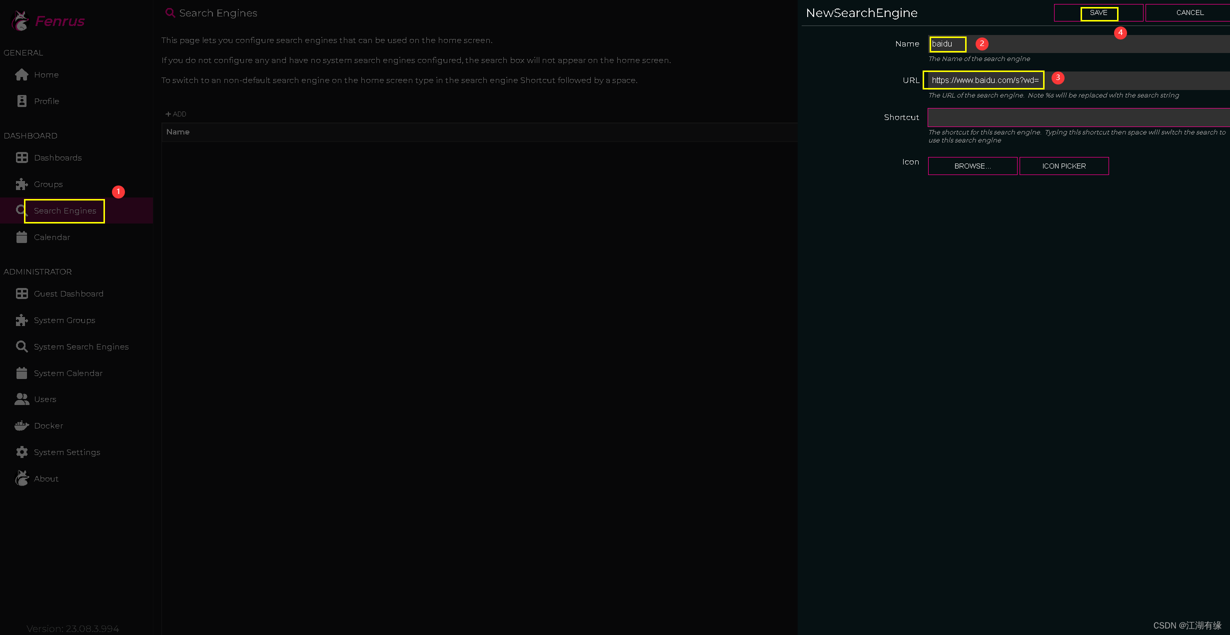 选择搜索引擎设置页面,填写百度搜索信息,保存。