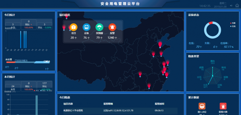平台首页显示快速工作台、本月隐患和故障统计以及项目信息地图导航, 快速工作台显示当前需要处理的任务及报警消息,提高处理速度;地图导航支持在电子地图上显示监控项目的分布情况,并在项目图标上显示客户和联系人信息,点击图标可进入项目详细信息。