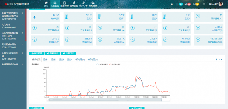 实时监控可以查看项目名称下的设备信息和探测器信息,探测器详细信息包括项目名称、所属设备、剩余电流、温度、三相电压电流、DI、DO等实时状态信息。同时具备权限的管理人员还可以对监控单元进行远程复位、分合闸等操作。
