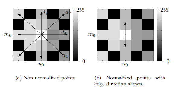指数k可调节以改变算法对di[n]差异的敏感度,敏感度随k增大而增强。使用向量的数量用I表示。与边缘方向对齐最接近的向量(即|di[−1]−di[+1]|最小值)将具有最大 ξi 权重。