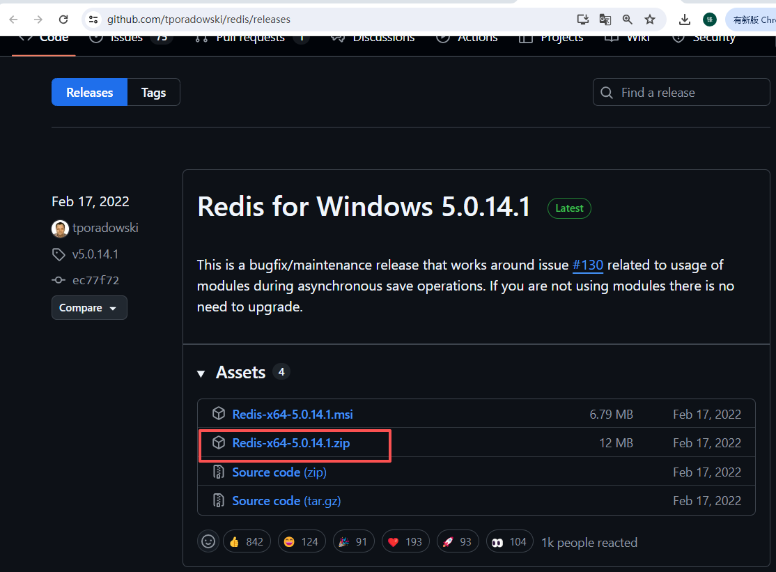 虽然 Redis 官方网站没有提供 Windows 版的安装包,但可以通过 GitHub 来下载 Windows 版 Redis 安装包,下载地址:https://github.com/tporadowski/redis/releases。