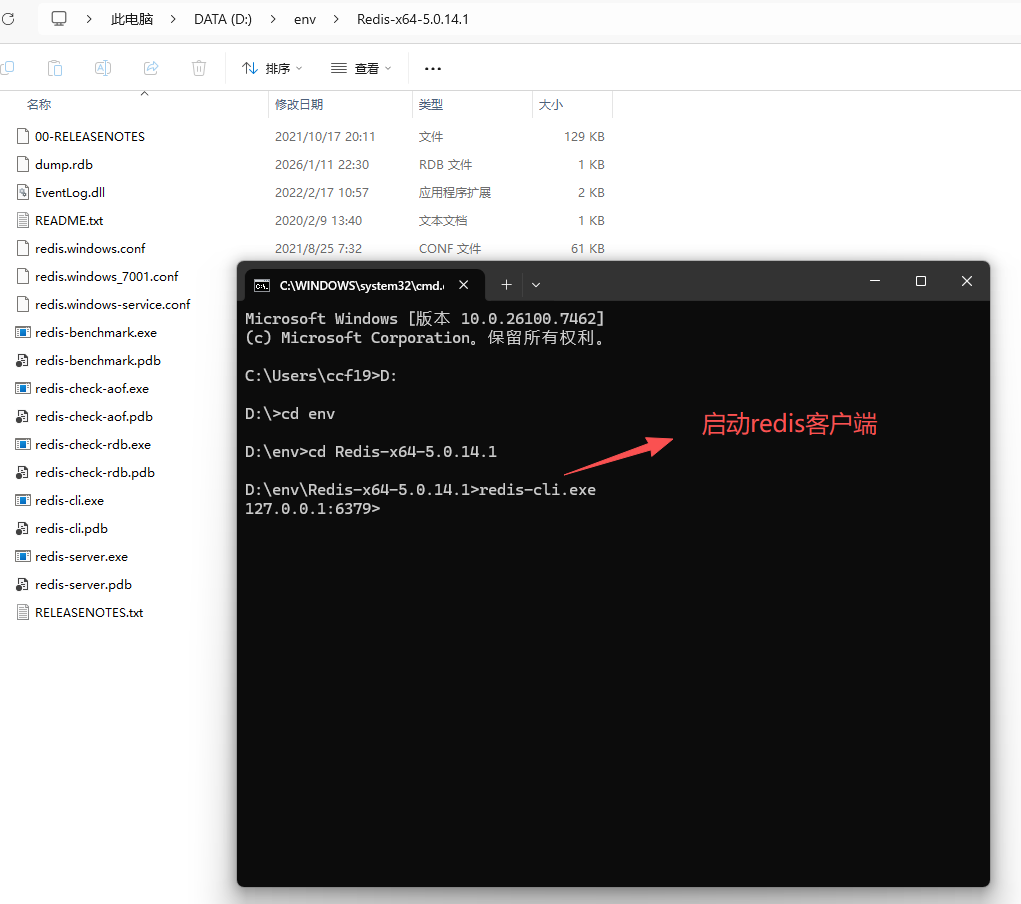 在 CMD 命令行输出 redis-cli 命令启动客户端,如下所示: