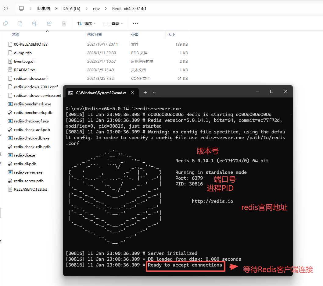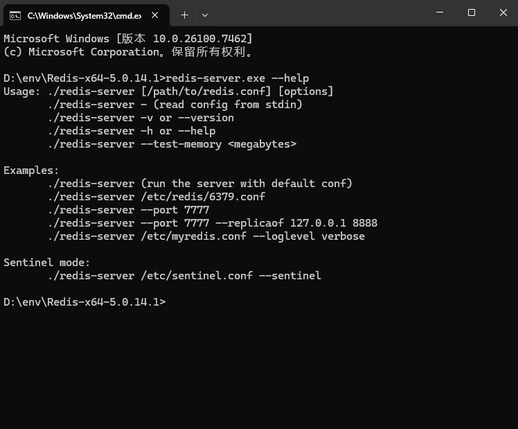进入Redis-x64-5.0.14.1.zip解压锁目录,比如D:\env\Redis-x64-5.0.14.1,并在该目录下打开Windows cmd命令行,输入redis-server.exe --help可以查看怎么启动redis服务