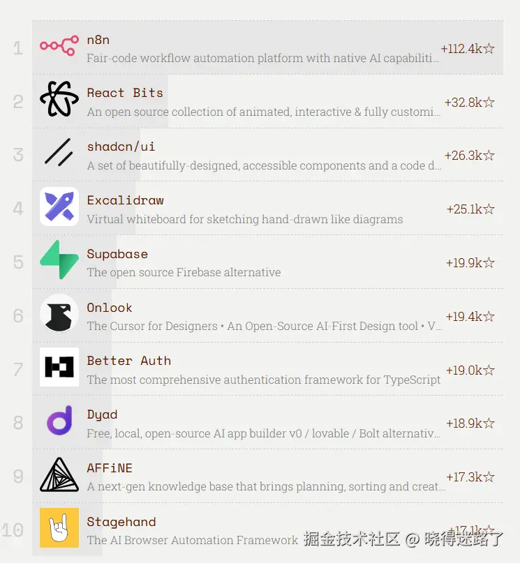 2025 年度 JavaScript 新星榜单:每年年初,迈克尔都会对过去一年在 GitHub 上热度最高的 JavaScript 生态项目进行汇总盘点。在连续两年蝉联榜首后,shadcn/ui 此次被 n8n 与 React Bits 超越,跌至第三名。这份榜单今年已是第十届(堪称里程碑),还收录了多位行业专家的深度点评,极具参考价值。
