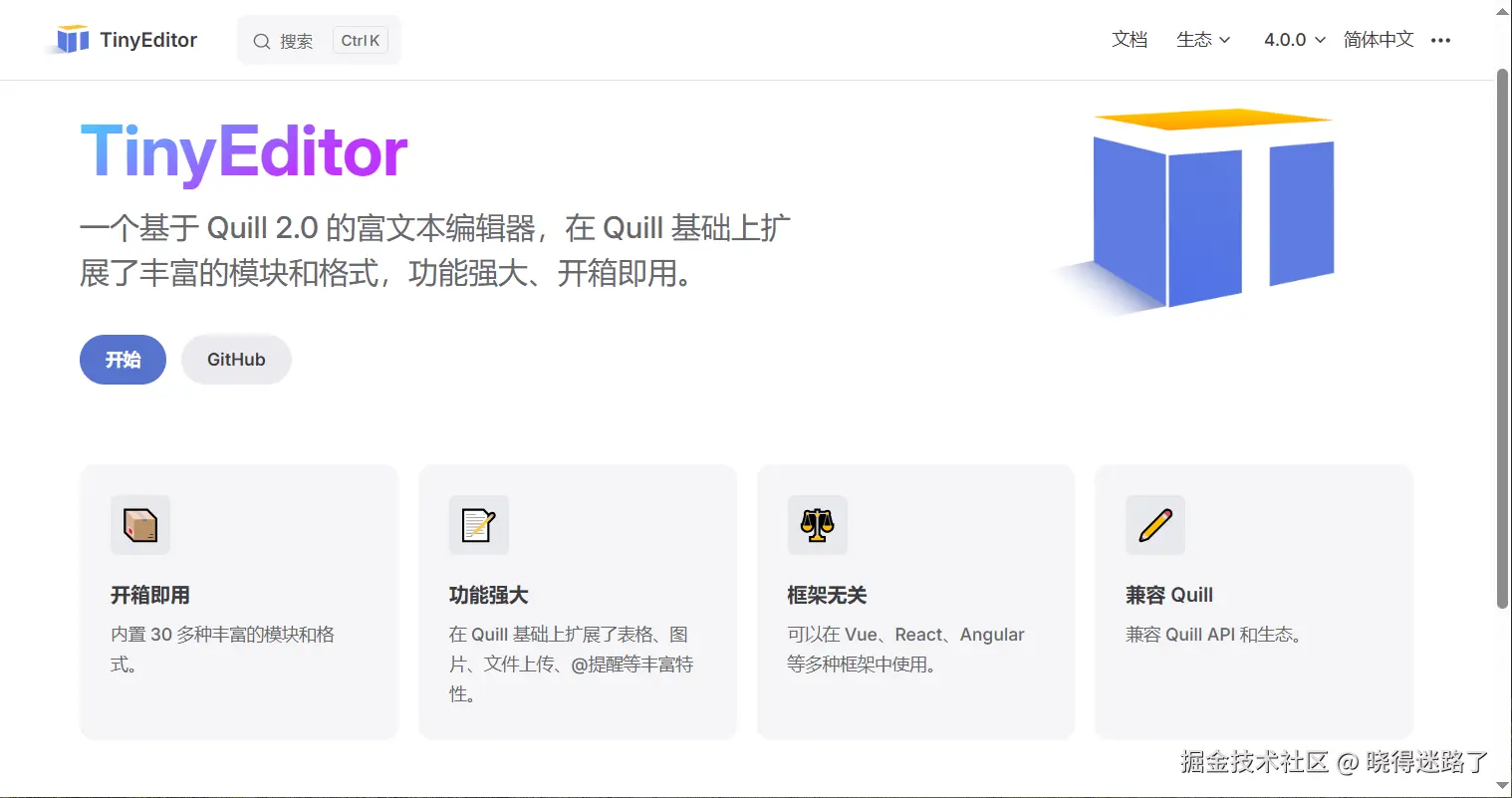- TinyEditor v4.0:TinyEditor 是一个基于 Quill 2.0 的富文本编辑器,在 Quill 基础上扩展了丰富的模块和格式,框架无关、功能强大、开箱即用。