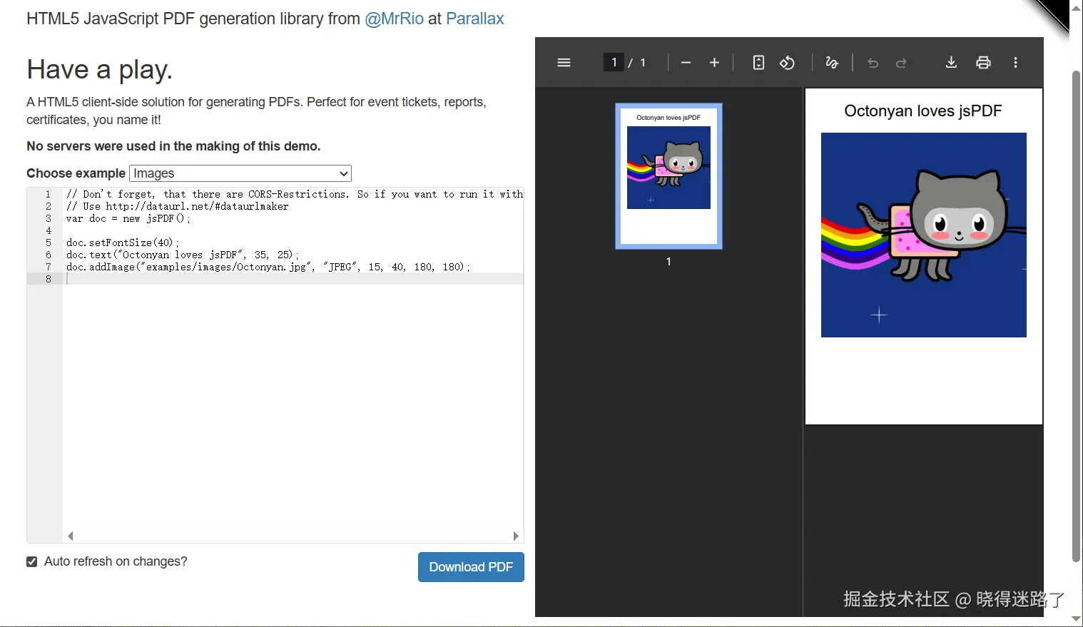 - jsPDF 4.0:JavaScript PDF 生成库,提供在线演示以及详尽的文档。