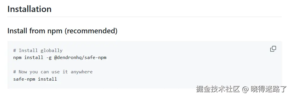 - safe-npm:安全安装 NPM 包工具,其工作机制为读取项目的依赖配置,仅安装公开发布时长满足指定要求的包版本(默认要求为公开满 90 天)。