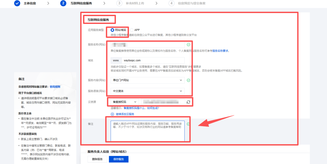 包括应用服务类型、服务名称(网站名称)、域名确认、服务内容(网站内容)、服务语言(网站)、云资源确认、备注信息。