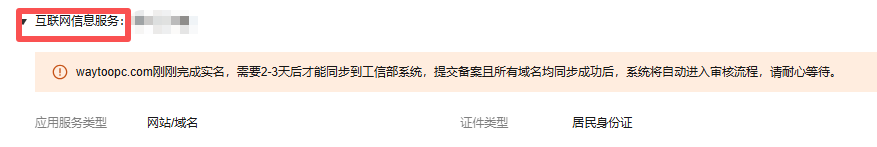 注意:如果域名是刚购买完成实名认证的话,在备案过程中,可能会遇到下面这个提示:"xxx域名刚刚完成实名,需要等待2-3天后才能同步到工信部系统,提交备案且所有域名均同步成功后,系统自动进入审核流程,请耐心等待。"