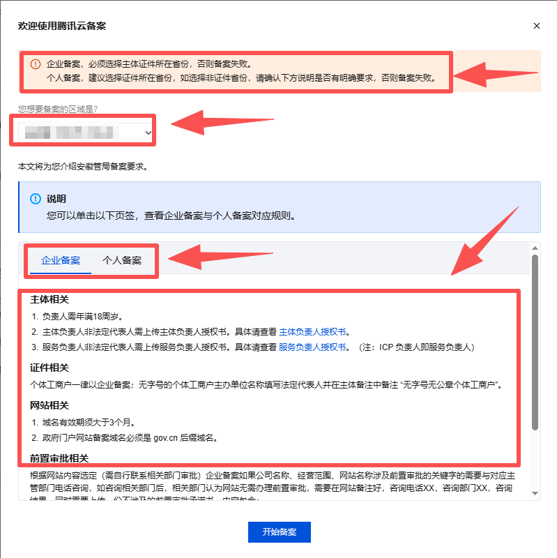 选择备案地区,要求是主体所在地区,比如我的主体在浙江杭州,就选择浙江杭州。