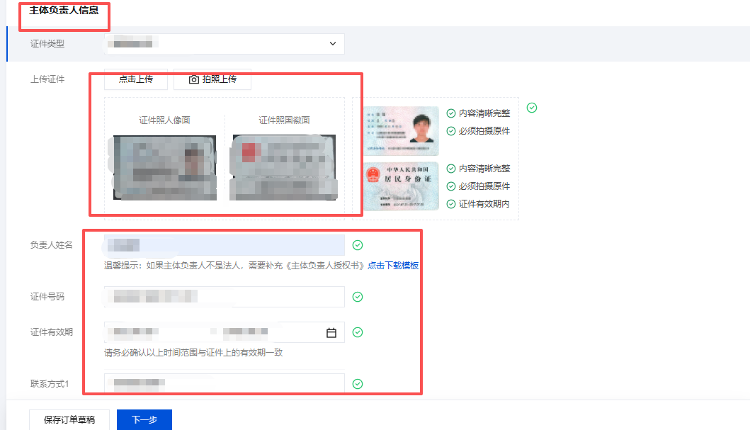 完善主体负责人信息,包括证件图片、证件号码、姓名、联系方式、邮箱。