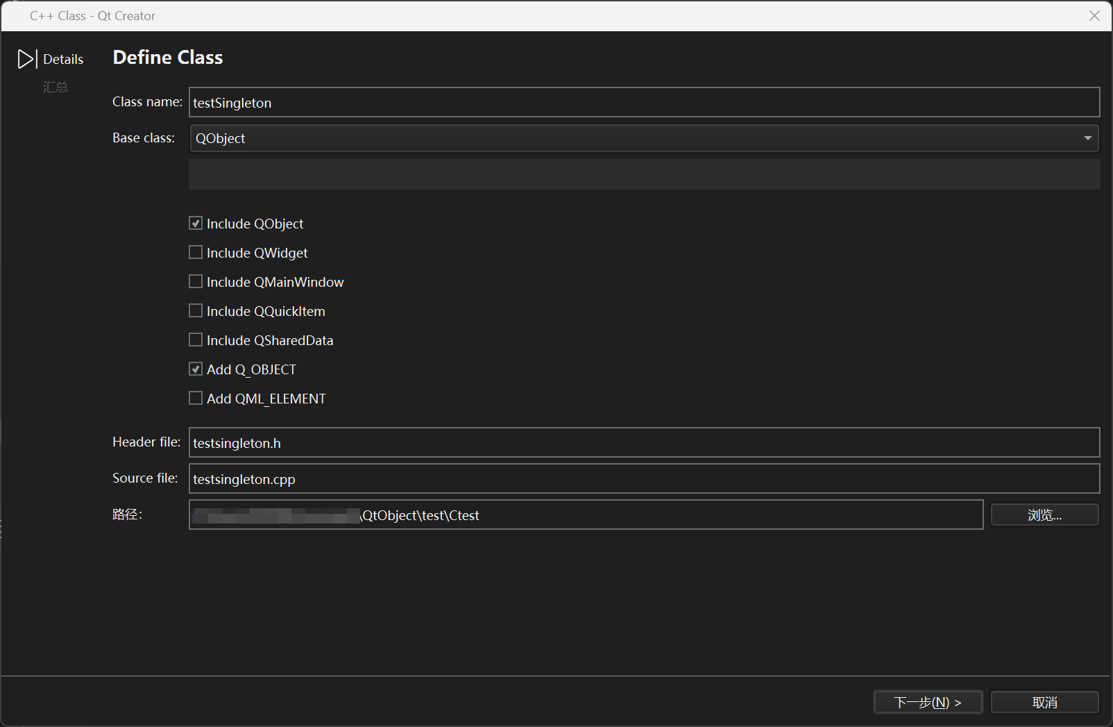 依旧继承QObject,然后在路径中输入想要创建的文件夹去管理.h和.cpp文件*(这样qt才会帮你去本地创建新文件夹)*