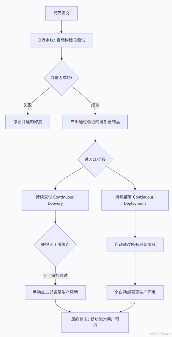 | 生产部署触发方式 | 人工审批后手动触发 | 自动化流水线自动触发 |