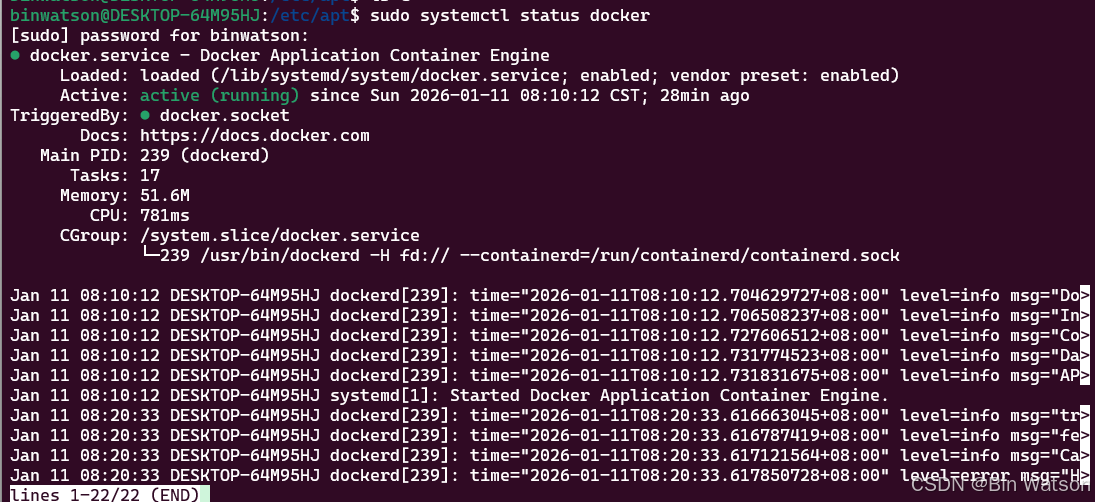 bashsudo systemctl start docker启动 docker 服务,如图为正常运行的截图: