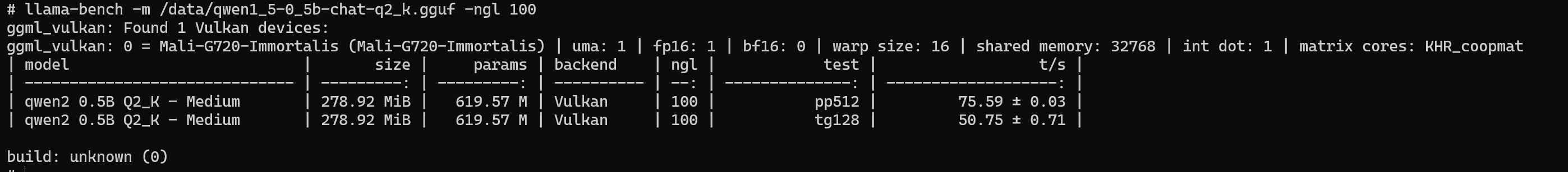 ggml_vulkan: 0 = Mali-G720-Immortalis (Mali-G720-Immortalis) | uma: 1 | fp16: 1 | bf16: 0 | warp size: 16 | shared memory: 32768 | int dot: 1 | matrix cores: KHR_coopmat
