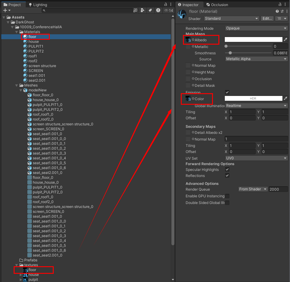 只要把对应材质的贴图拖进 Albedo 与 Color框选中 就完成模型贴图了