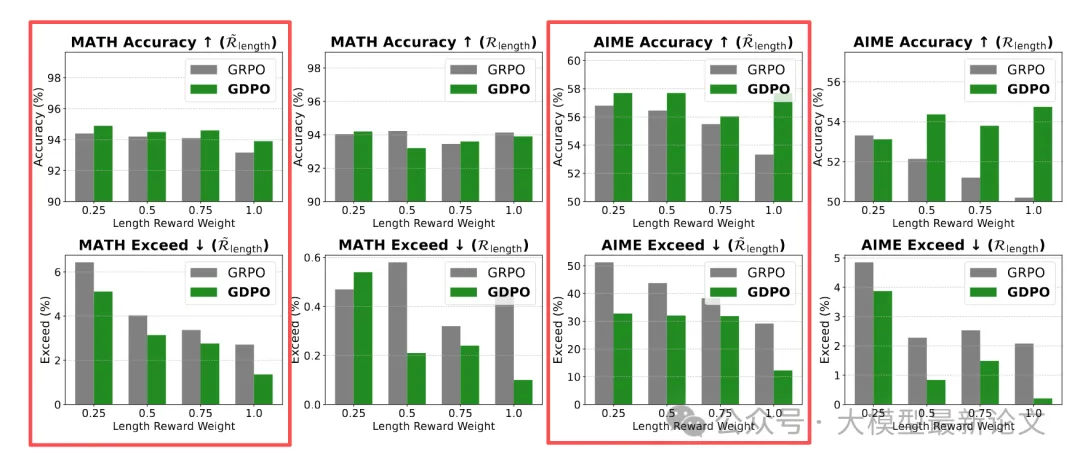上图展示了标准 GRPO 与 GDPO 在使用上述不同奖励权重组合的情况下,准确率与超长率(回答长度超过限制)变化情况,其中红框中的是使用条件化长度奖励的结果,可见: